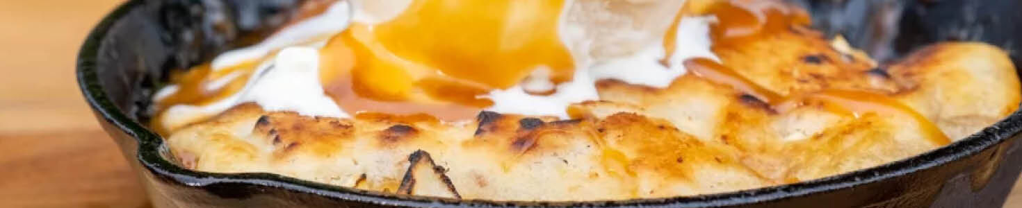 - Für den Cobbler: Vier kleine gusseiserne Pfannen nehmen. Eine Schicht Karamell auf den Boden geben und die Apfelstücke darauf verteilen. Den Streuselteig darüber verteilen und glatt streichen.