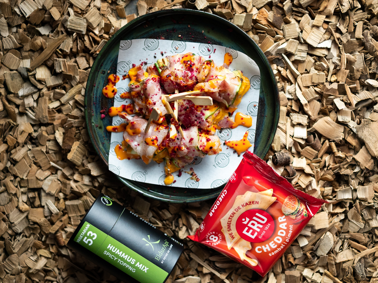 - Einen Scheibe Speck flach hinlegen, eine Zucchinistreifen darauflegen und mit EldurApi 53 Hummus Mix bestreuen.