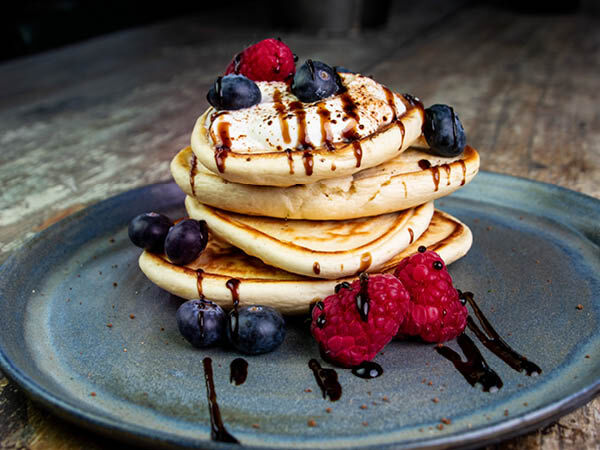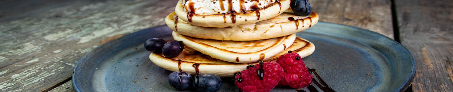 When the pancakes are ready, you can garnish them with fruit and yoghurt, for example. Enjoy your meal!