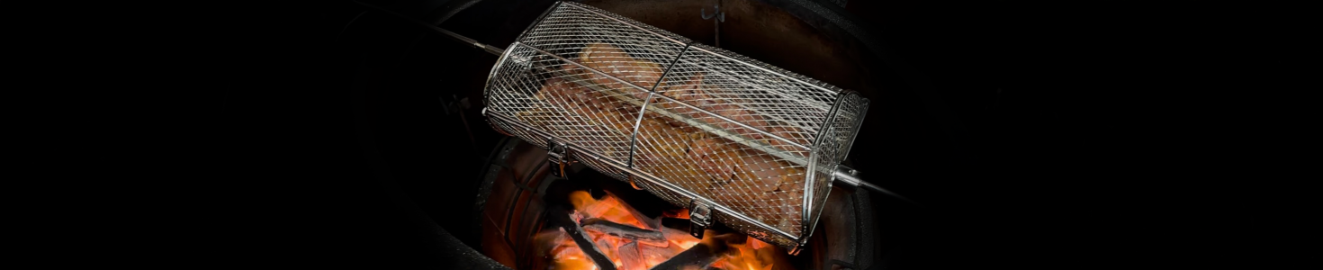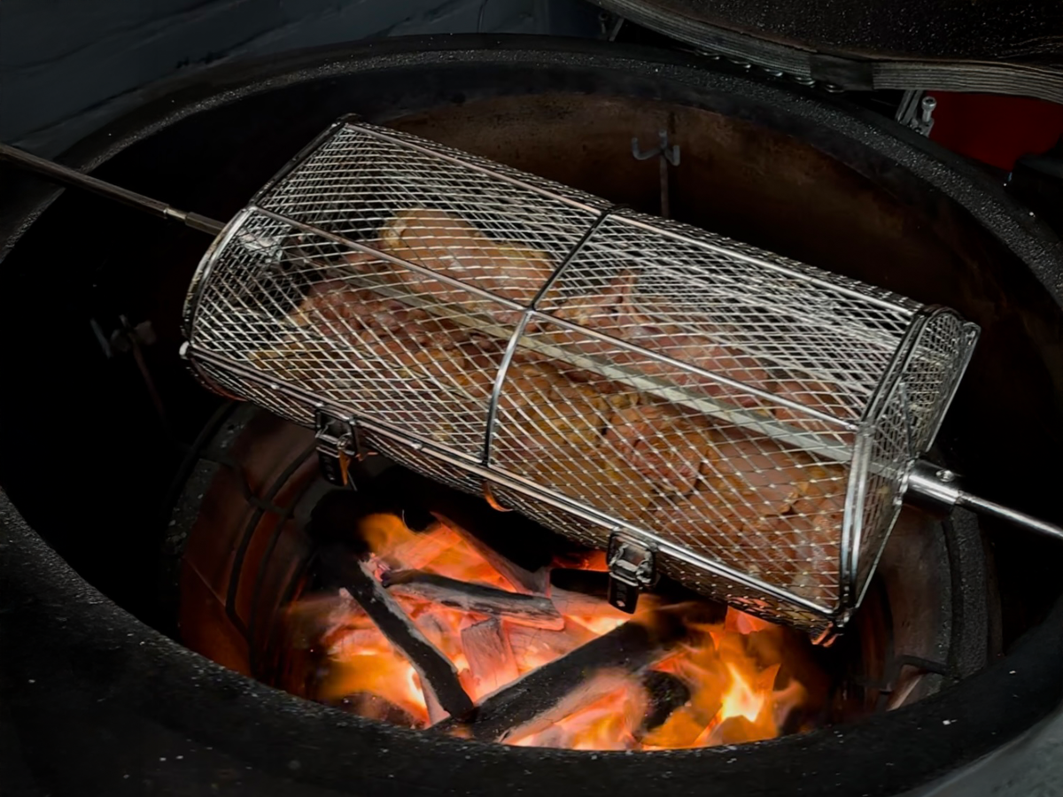 - Check if the Rotisserie basket is rotating properly before closing the Kamado. Let the chicken thighs cook in the Kamado for about 30 minutes.
