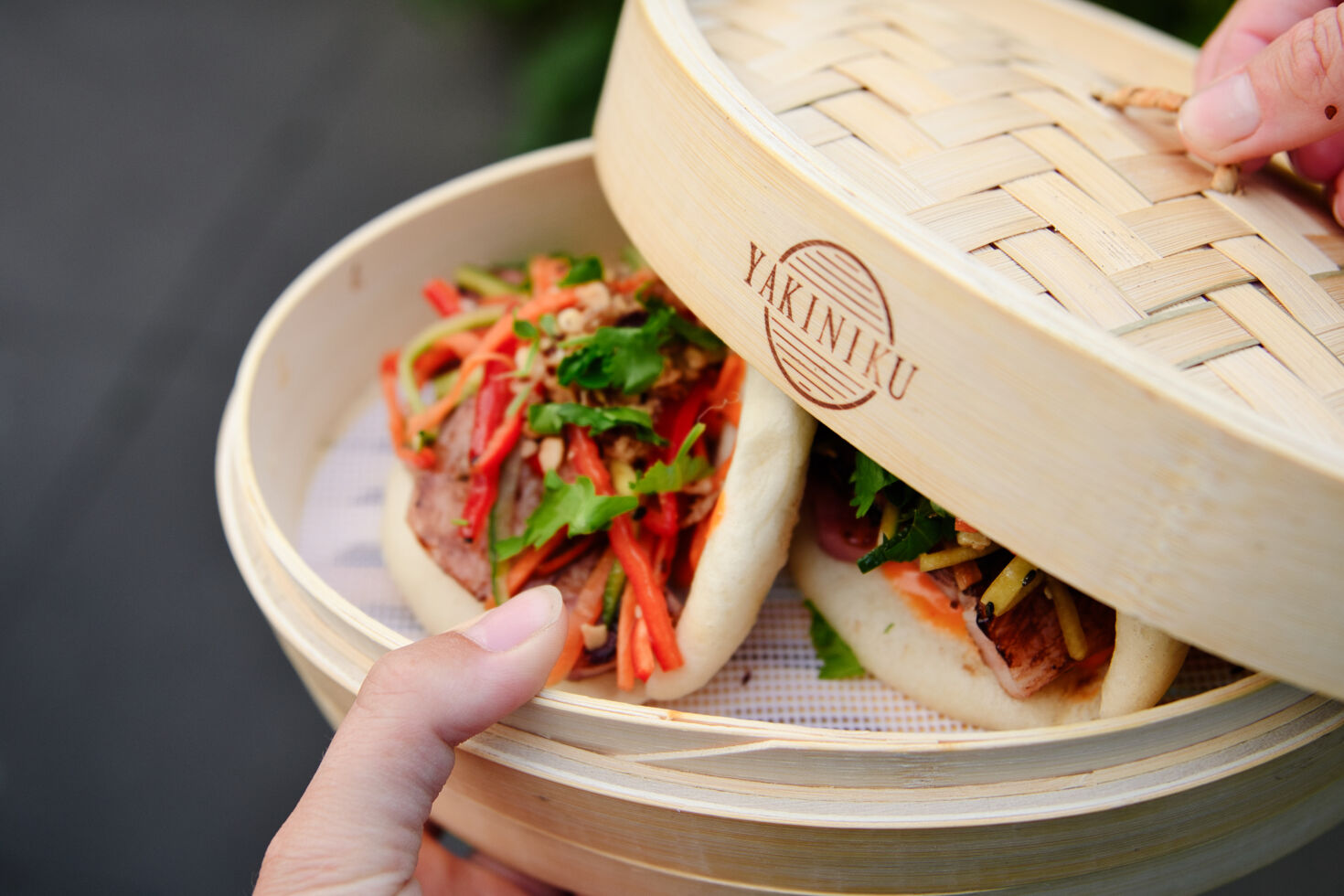 - Place a steam basket on the pan and steam the bao buns for 12 minutes with the Kamado lid closed.