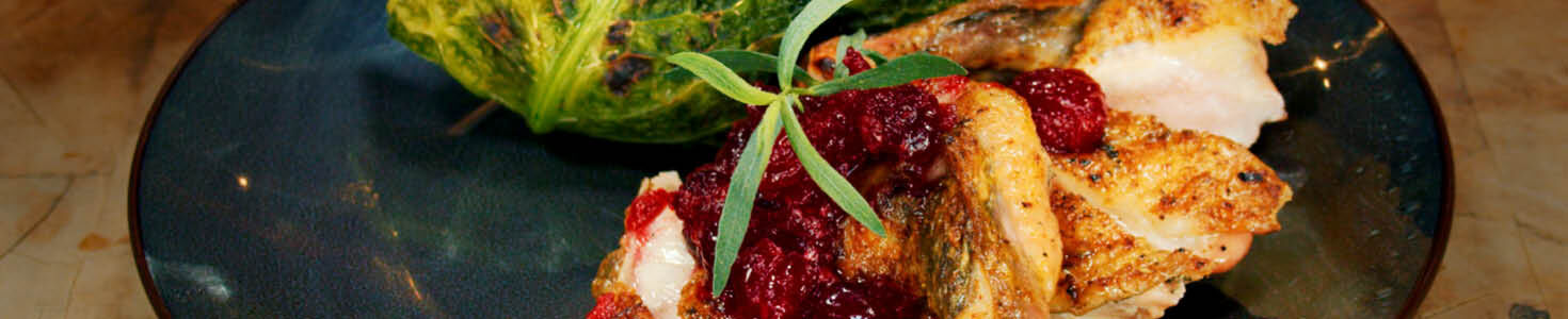 - When the guinea fowl is ready, cut the fillets from the carcass and divide into pieces. Warm the cranberries and serve on a warm plate.