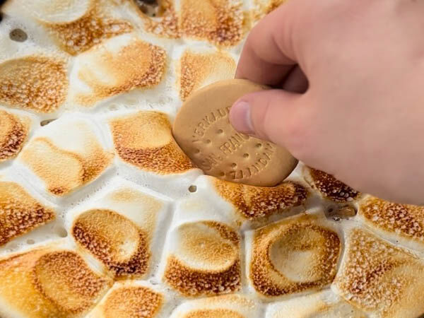 - Remove the pan from the Kamado and dip the S'mores with the remaining biscuits!