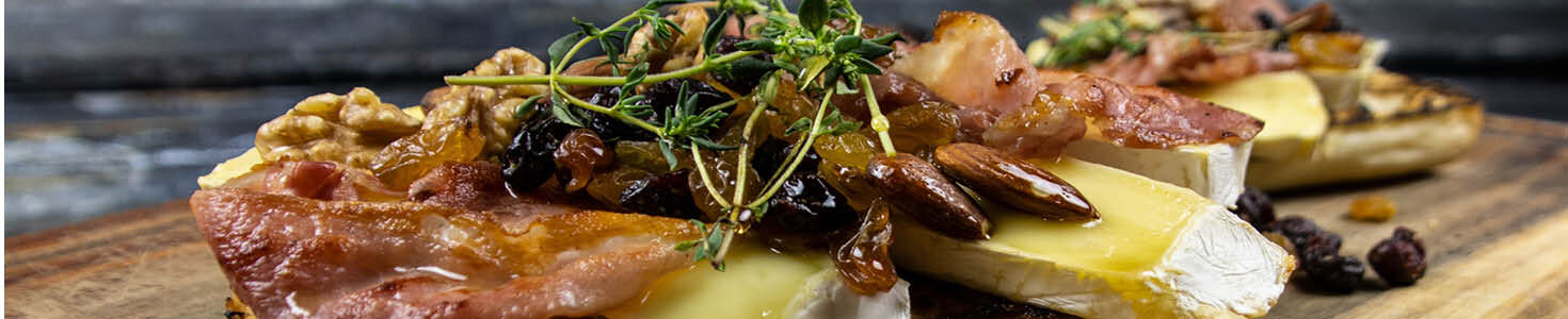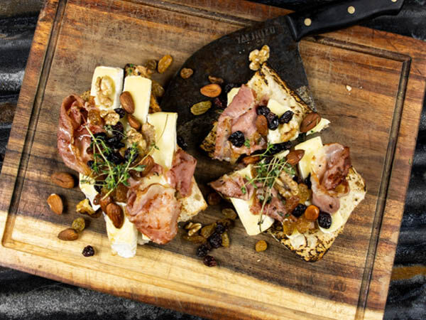 Cut the brie into slices about 1 cm thick and cover the bun with these. Then also place the ham, nuts and thyme on the bun. This can be left whole on the Kamado for a few minutes until the cheese starts to melt slightly.