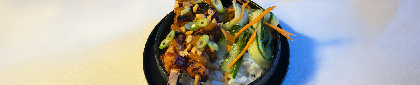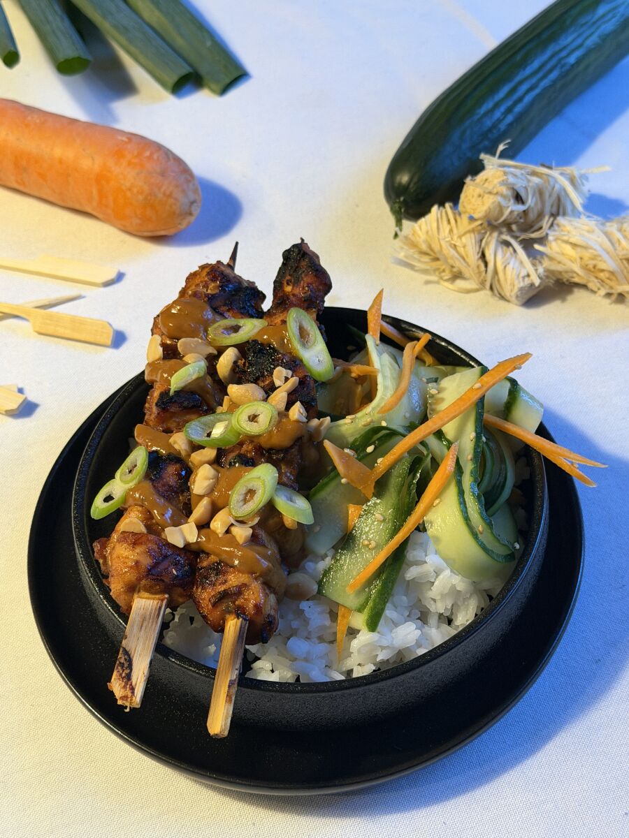 - Serve rice on the plate, place the satay skewers diagonally on top, and add the cucumber ribbons and peanut sauce.
