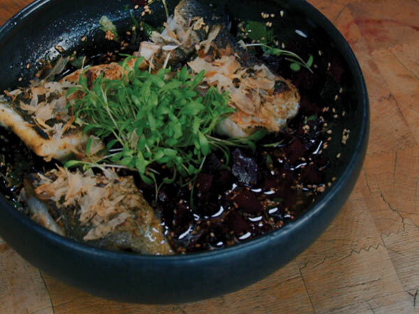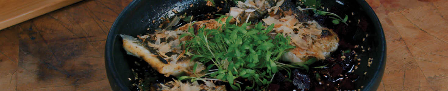 Then finish the plate with the beetroot, sea bass and garnish with some cress for spiciness.