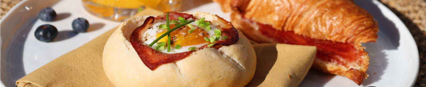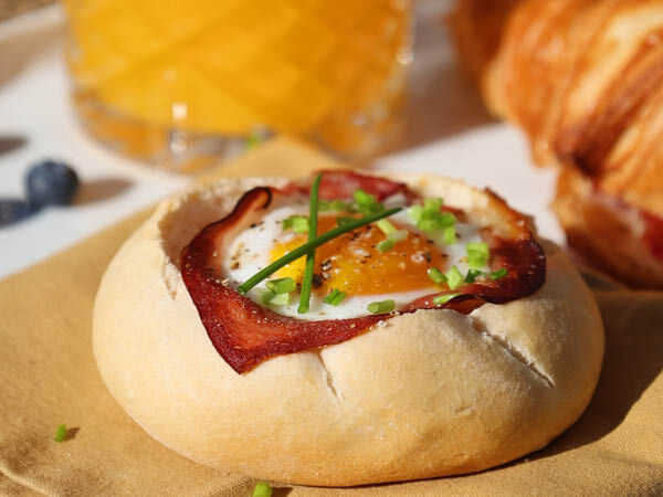 - Then place a slice of bacon in each bun and break 1 egg over each bun. Then sprinkle the buns with salt and pepper.