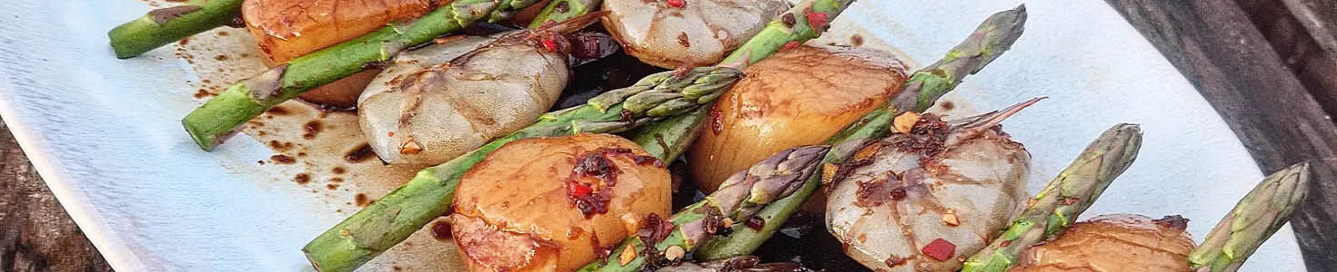 - When the Kamado is getting up to temperature, it's time to prepare the skewers. The order of the skewer: asparagus tip, scallops, prawn. You use the asparagus tips, so to speak, to hold the scallops and prawns in place.