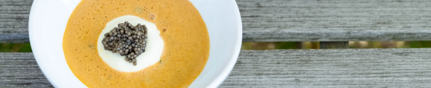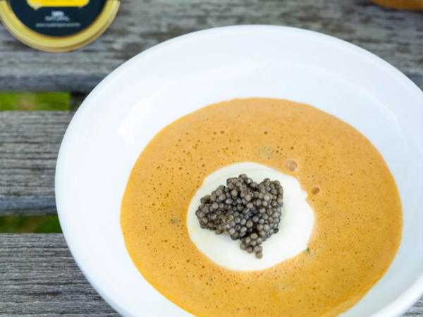 - For the garnish, cut the apple into brunoise. Mix with lime juice and zest and finely chopped coriander leaves. Spoon the brunoise into a small soup bowl. Pipe a dollop of crème fraîche on top and add a spoonful of caviar.