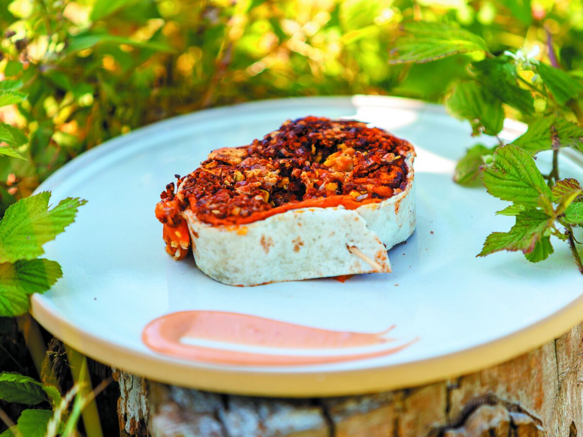 - Distribute one layer of sweet potato slices over the wrap. Then spoon the lentil mixture over it, followed by the crumbled trortillia chips and a generous layer of cheese.