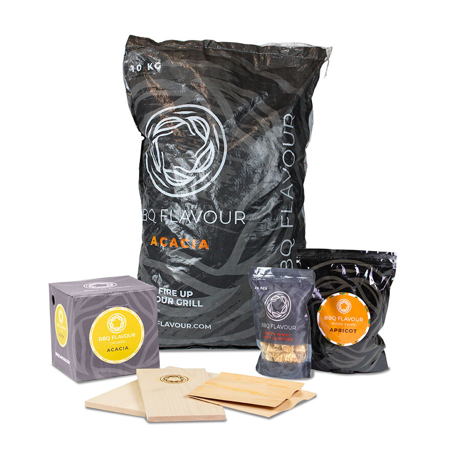 Il pacchetto Smoke & Flavour consente di aggiungere facilmente aromi agli ingredienti. Questa confezione contiene BBQ Flavour Acacia, un carbone di alta qualità. Il Marabu brucia a lungo, è molto adatto alle alte temperature e fa poco fumo. Questo carbone è naturale al 100%. La paglietta in dotazione è ideale per accendere la carbonella Acacia. Mettete qualche pezzo di paglietta tra le braci e accendetelo: le braci bruceranno facilmente. Ora è arrivato il momento di grigliare! Per una gustosa sensazione di affumicato, usate il legno per affumicatura di albicocco. Questo legno è perfetto per formaggi, tacchino, pollo, maiale e pesce. I pezzi di acacia sono invece perfetti per pollame, manzo e maiale. L'affumicatore BBQ Flavour viene utilizzato per conferire agli ingredienti un aroma di fumo neutro e per dare loro un colore che va dal rosso al marrone. L'ultimo condimento di questa confezione è l'involucro BBQ Flavour in ontano. Potrete avvolgervi i vostri ingredienti. I sapori e i succhi saranno ben conservati. Potrete anche immergere questi involucri nel vino o nel rum, ad esempio.