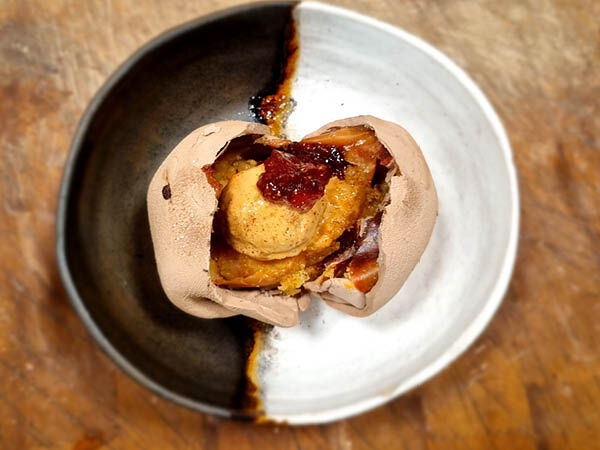 - Zodra de appel uit de Kamado is gehaald sla je deze open met een scherp mes of hamer(tje). Let hierbij wel op dat er resten van de klei in de appelmoes terecht kunnen komen.
