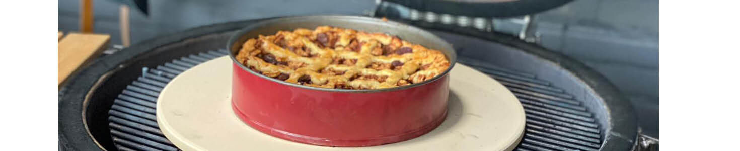 - Bak de appeltaart in het midden van de Kamado bovenop de pizzasteen in 55-60 minuten goudbruin en haal daarna de appeltaart van de BBQ. Leg de laatste minuten een appel-chunk op de kolen zodat de smaak van de appeltaart nog intenser wordt.
