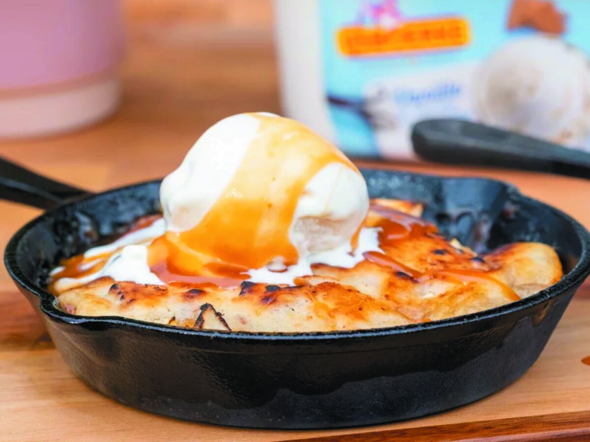 - Serveer met vanille-ijs en giet de overige karamel eroverheen.