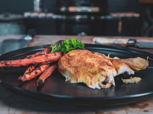 • Als de kip gaar is haal je hem uit de Kamado en dan is het tijd om je gerecht op te dienen. Je kunt de venkel en de ui uit de kip scheppen en gebruiken als garnituur. Leg ook de wortels en de kip op het bord.