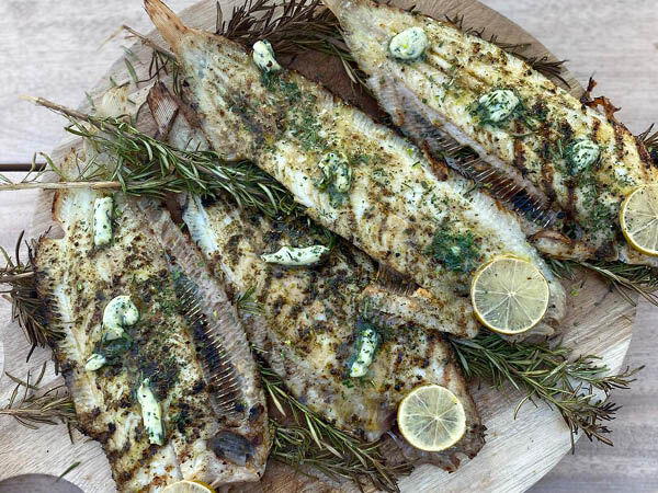 Ondertussen maak je op het rooster 6 bedjes, elk bedje maak je met 2 plakjes citroen en 2 takjes rozemarijn. Wanneer de sliptongen kort zijn aangebakken op de teppanyaki plaat leg je de sliptongen op het bedje. Laat de sliptongen aan beide kanten kort grillen.