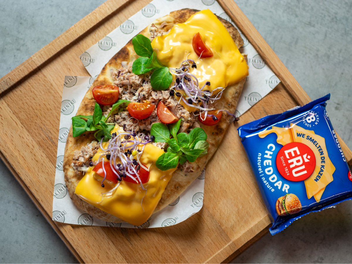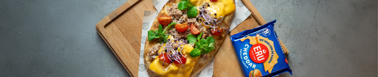 - Leg de ERU Slices Cheddar Natural plakken gelijkmatig over het tonijnmengsel.